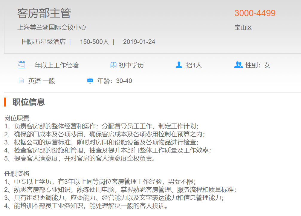 上海美兰湖高尔夫度假酒店客房部主管