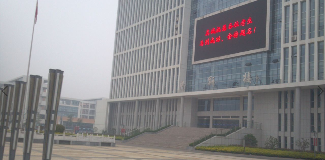 进了学校大门就可以看见学校的主楼——中龢楼,那楼有很多教室,有计算机教室、音乐教室、校长的办公室等等,还有一间教室里有台球桌,我们有机会就会进去玩玩。这楼还是挺高的,有10层这样子。楼的表面还有一块屏幕,楼前就是国旗台,每周一上午二节课下,我们全校学生都会在这个国旗台一周集合举行升旗仪式,屏幕上会公布上一周各年级的量化积分排名,还有一些优秀学生的事迹并让他们在国旗下讲话,分享学习方法与经验。屏幕上也总会显示关于交通安全的文字,然后配上一些交通事故的图片,并由一名主任给我普及交通安全的知识。在小高考过后,屏幕上也会将获得4A的学生的照片、姓名、班级都公布在上面,以此来奖赏他们,并鼓励下一届的学生。而且学校会在高三学生放寒假就在上面写上关于高考的话语,让高三学子有危机感,让他们不要因为过年而过度放松,要时刻警醒自己,督促自己的学习。