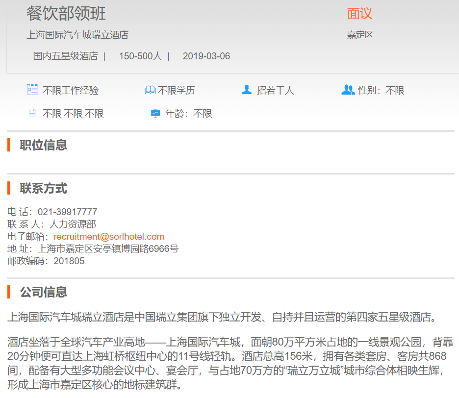 上海国际汽车城瑞立酒店餐饮部领班