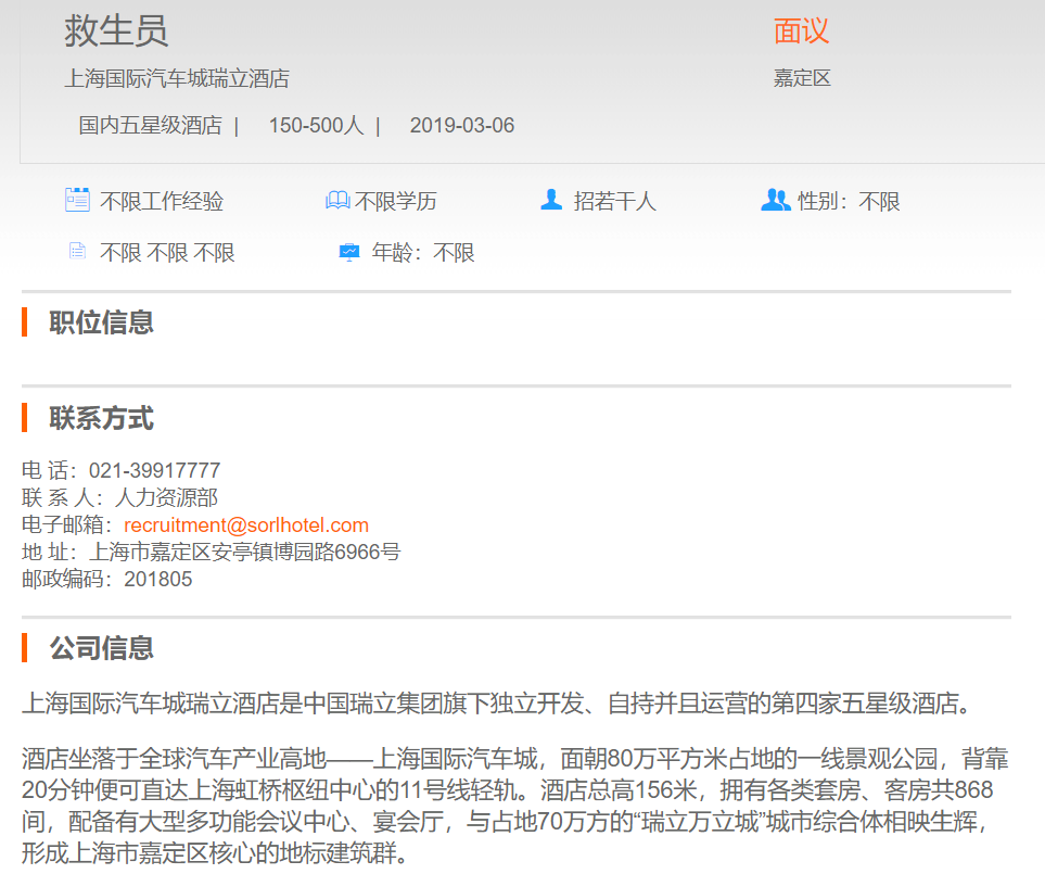 上海国际汽车城瑞立酒店救生员