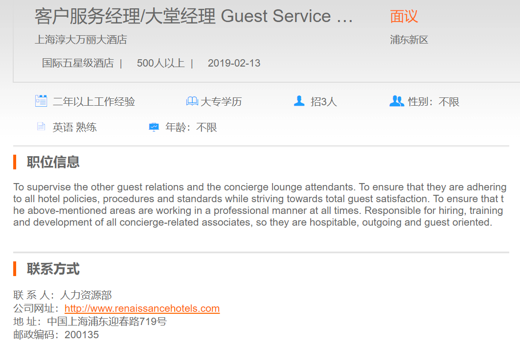 上海淳大万丽酒店客户服务经理|大堂经理