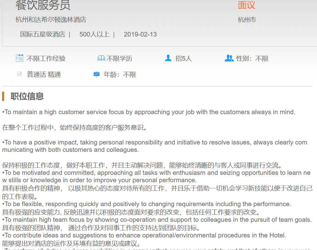 杭州和达希尔顿逸林酒店餐饮服务员