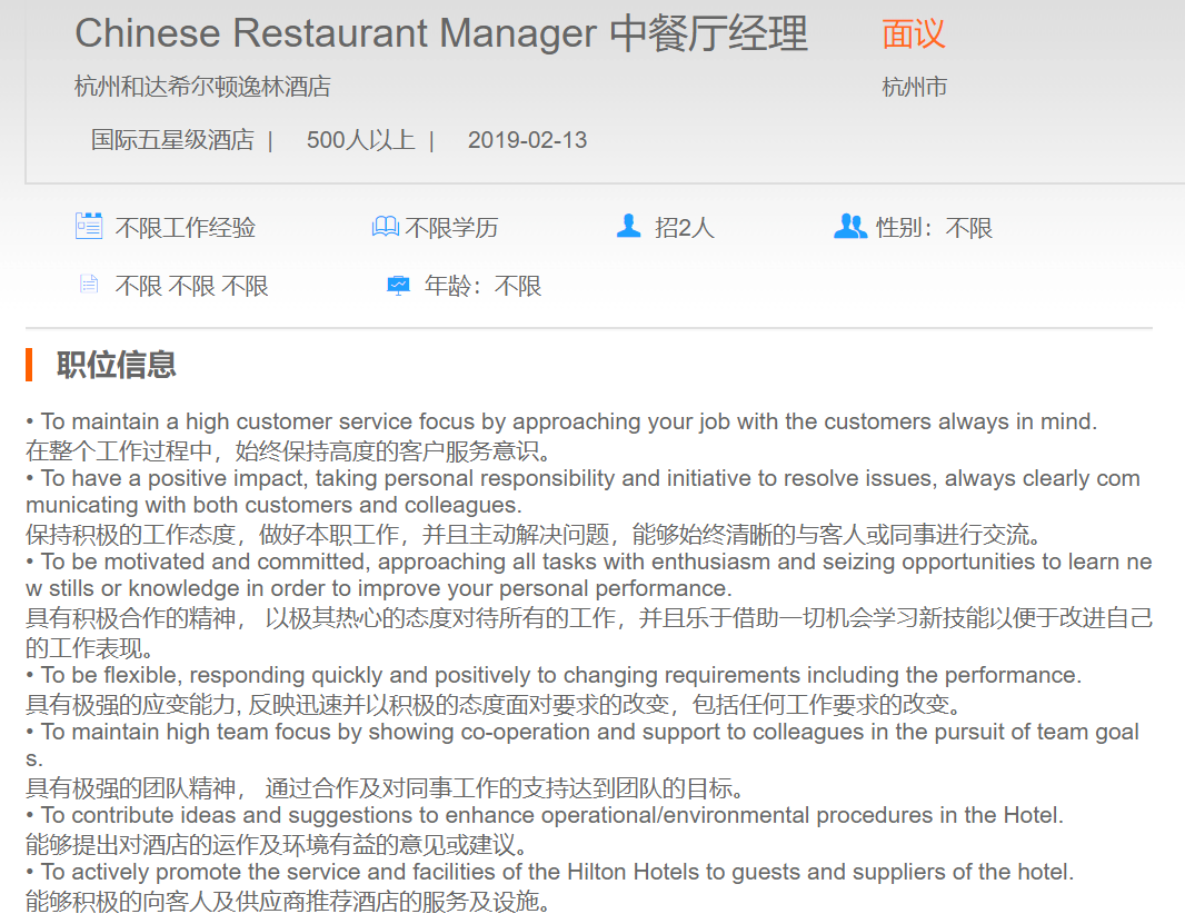 杭州和达希尔顿逸林酒店中餐厅经理