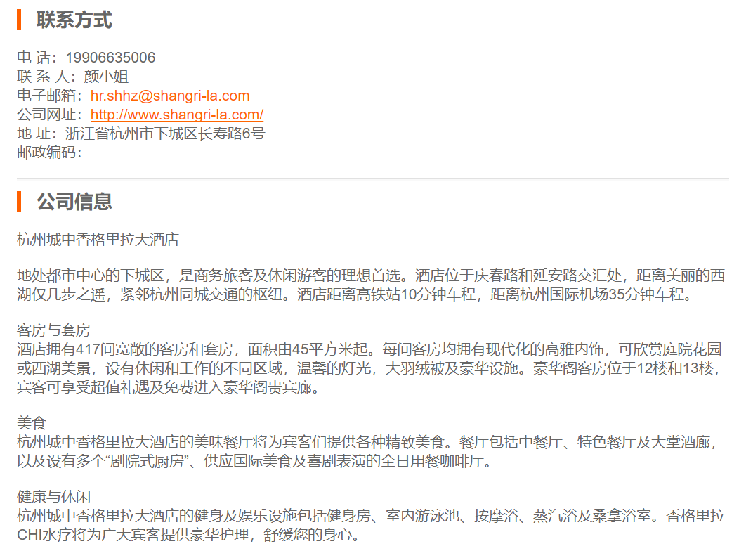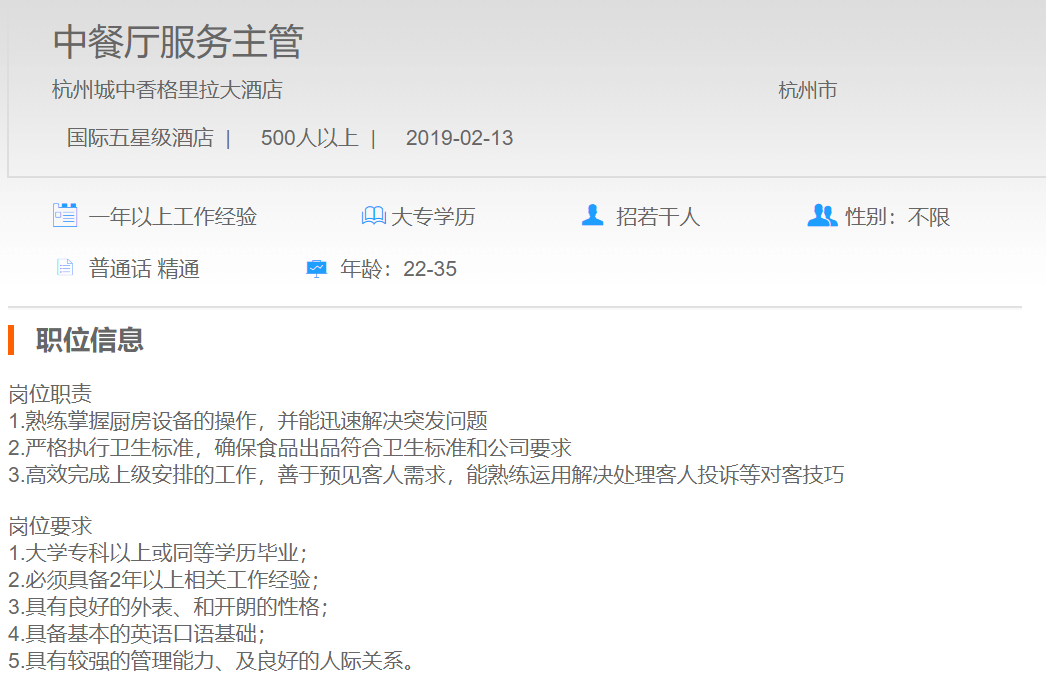 杭州城中香格里拉大酒店中餐厅服务主管