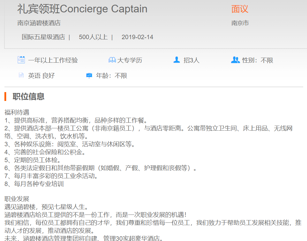 南京涵碧楼酒店礼宾领班