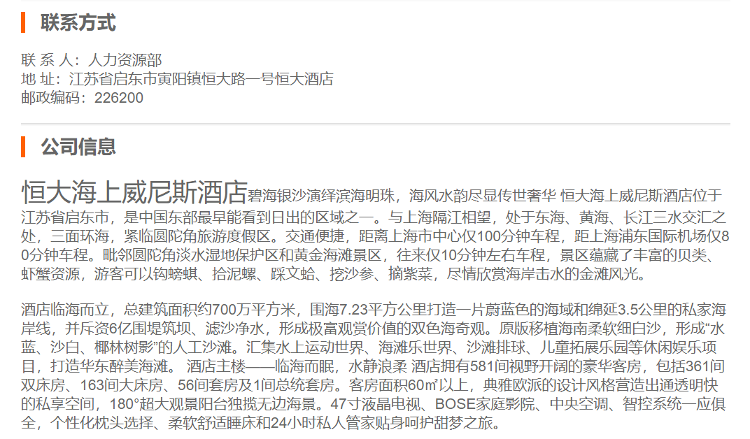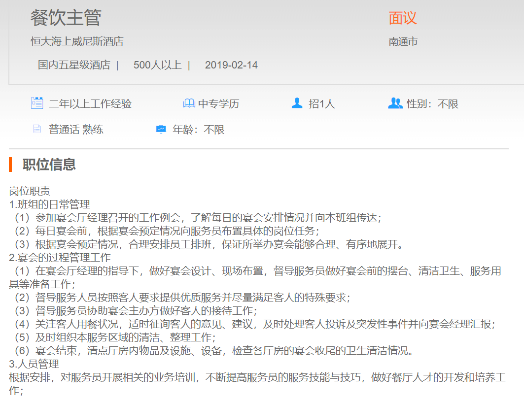 恒大海上威尼斯酒店餐饮主管