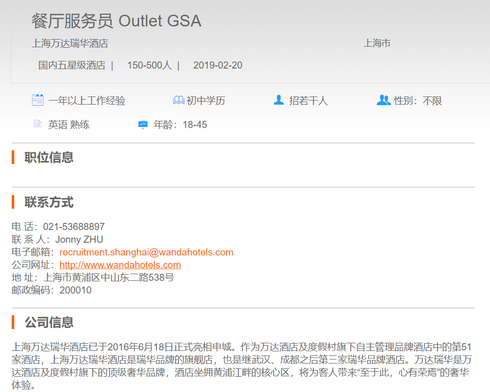 上海万达瑞华酒店餐厅服务员