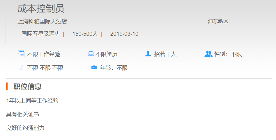 上海科雅国际大酒店成本控制员
