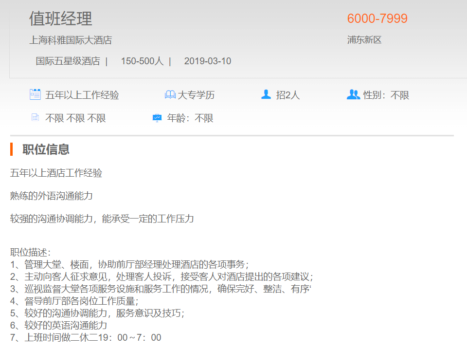 上海科雅国际大酒店值班经理