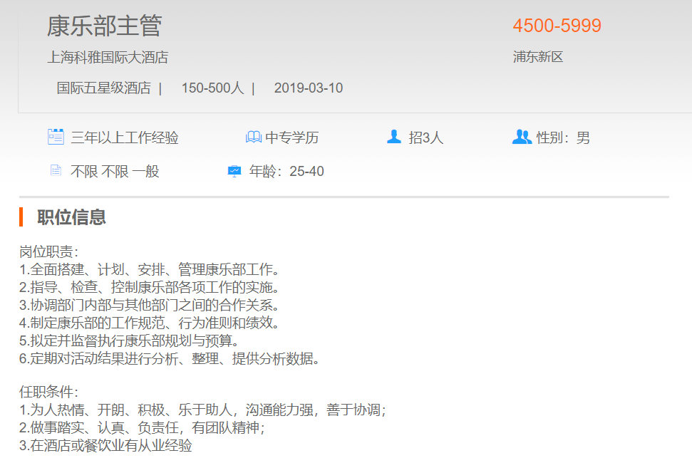 上海科雅国际大酒店康乐部主管