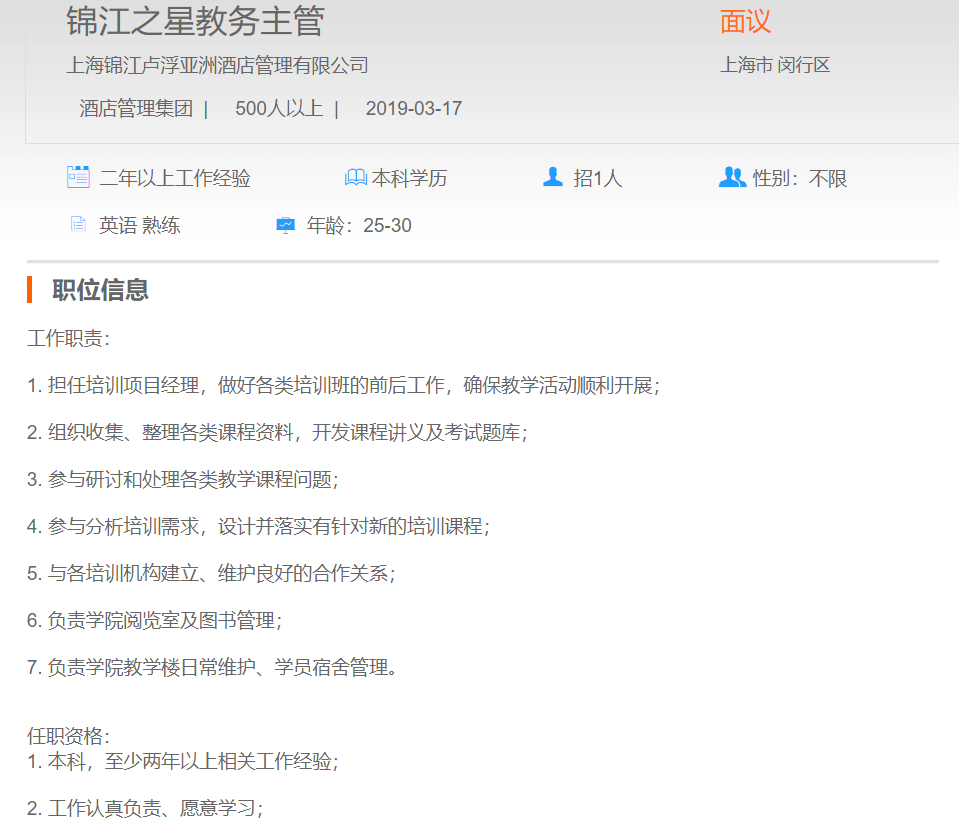 上海锦江卢浮亚洲酒店管理有限公司锦江之星教务主管