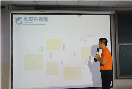 此次校招宣讲会由本院正在携程三亚分公司人力资源部实习的孙婧如作为主持人,刚开始先播放了几个关于携程的视频,引出了“让世界触手可及”的理念,让大家对携程有了初步的了解,随后请出了本次的主讲人周新宇先生。周新宇先生用“让宇宙体验你的影响力”作为主题开始宣讲,首先用表格数据介绍了旅游行业中的携程,紧接着用整个大幅页面介绍携程家族,在国内拥有住宿业、交通、度假、科技和OTA五大分支,在国外也拥有众多子公司,其强大的统治力帮助携程位居全球第二、中国第一的在线旅游平台。