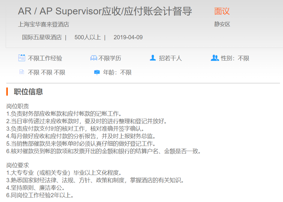 上海宝华喜来登酒店应收/应付账会计督导