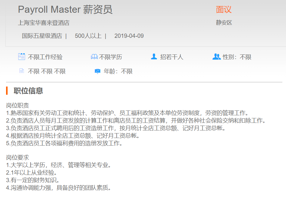 上海宝华喜来登酒店薪资员