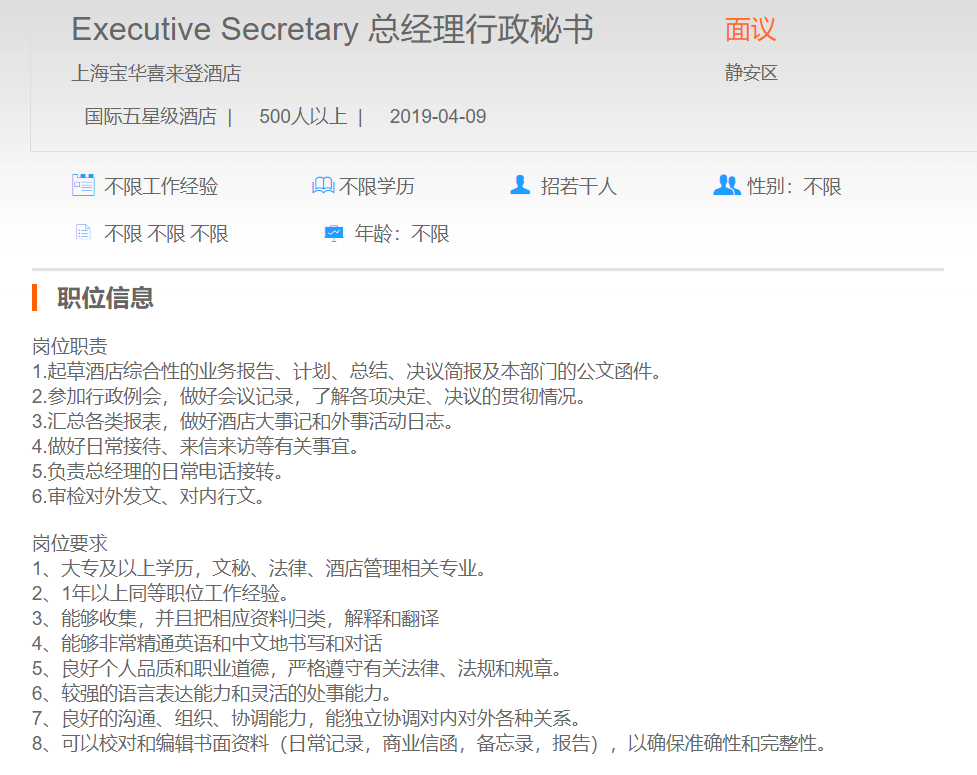 上海宝华喜来登酒店总经理行政秘书