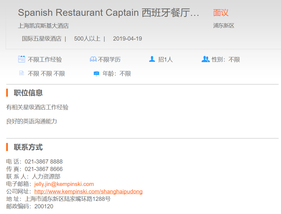 上海凯宾斯基大酒店西班牙餐厅领班