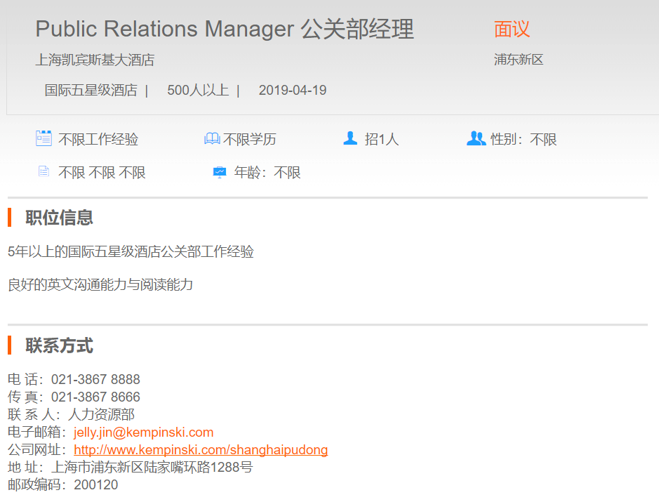 上海凯宾斯基大酒店公关部经理
