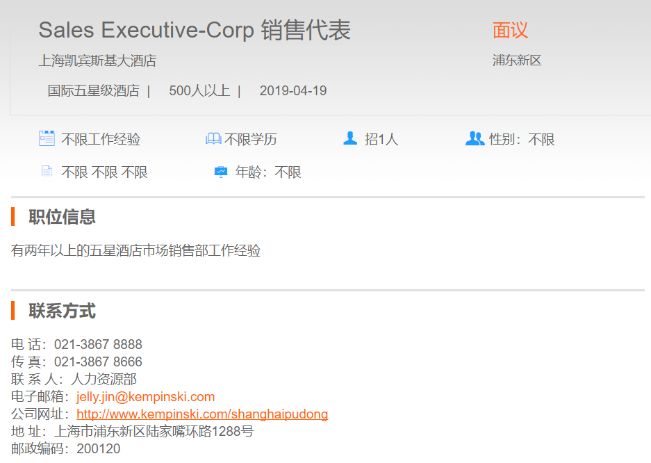 上海凯宾斯基大酒店销售代表