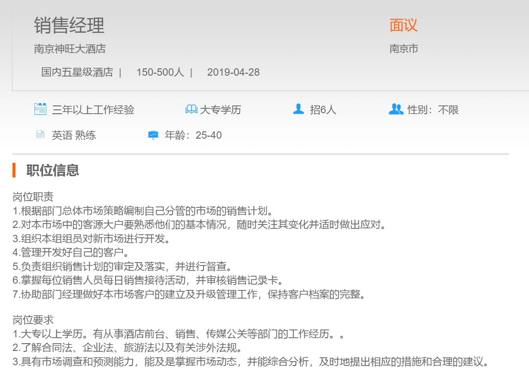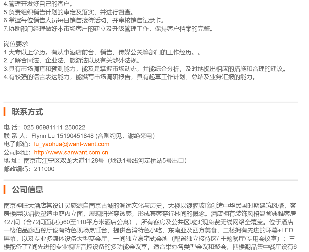 南京神旺大酒店销售经理