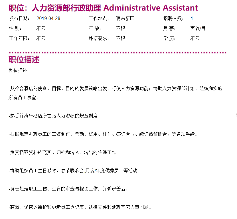 上海滴水湖皇冠假日酒店人力资源部行政助理