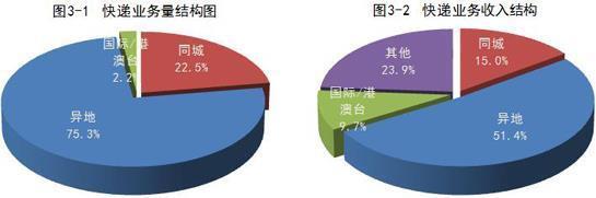 与去年同期相比,同城快递业务量的比重下降0.6个百分点,异地快递业务量的比重上升0.5个百分点,国际/港澳台业务量的比重上升0.1个百分点。