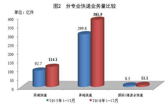 2018年,全国快递服务企业业务量累计完成507.1亿件,居世界第一,超美日欧总和。业务量同比增长26.6%;业务收入累计完成6038.4亿元,同比增长21.8%。其中,同城业务量累计完成114.1亿件,同比增长23.1%;异地业务量累计完成381.9亿件,同比增长27.5%;国际/港澳台业务量累计完成11.1亿件,同比增长34%。