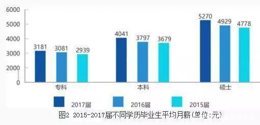 这里有一份2015-2017年本科生和专科生就业率的对比图。从图上可以看出,专科毕业生的就业率居然比本科要高,2016年的时候甚至和硕士差不多。再来看毕业的平均薪资待遇,专科和本科的差距在700-1000左右。