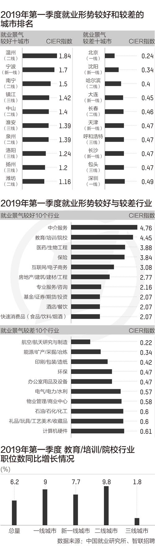受春节后职场“跳槽热”和高校毕业生“春季招聘期”等因素影响,今年第一季度就业景气指数(CIER指数)呈现回落。在互联网、金融等热门行业招聘需求持续减少的同时,教育培训等行业呈现出逆势上升的态势。