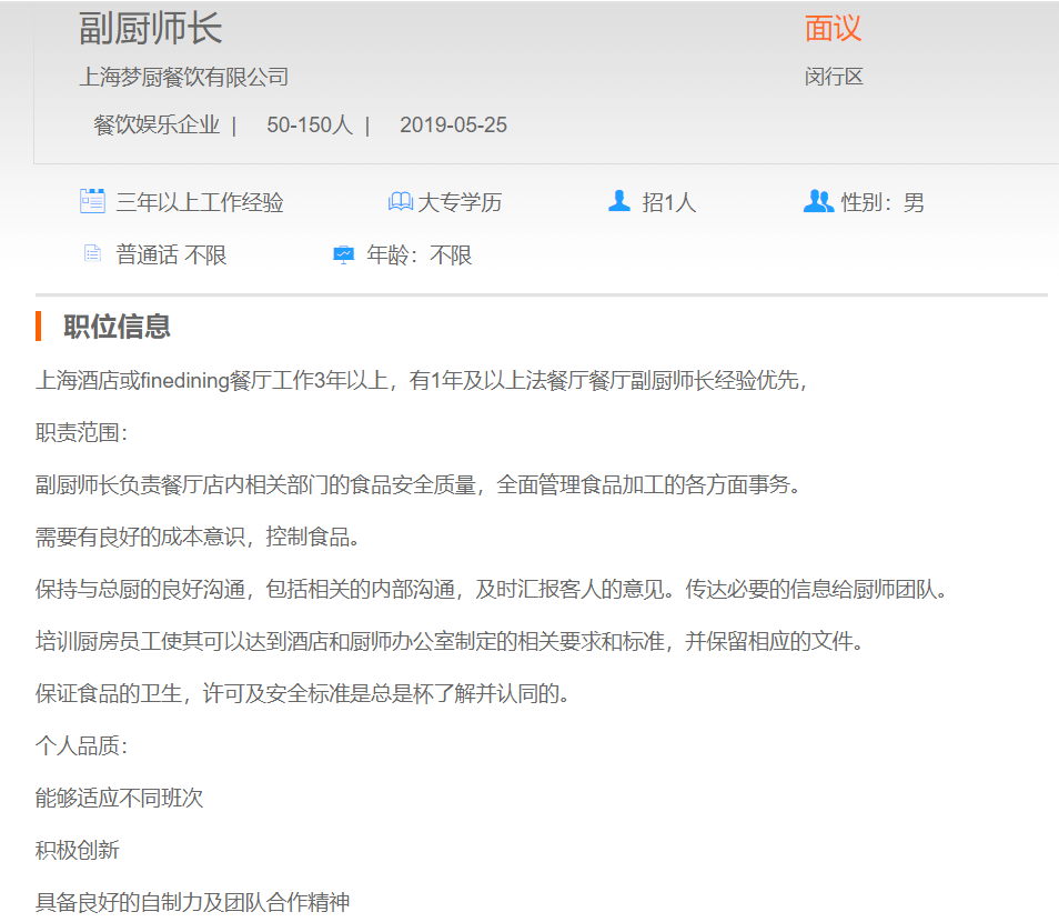 上海梦厨餐饮有限公司副厨师长