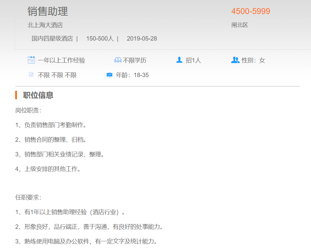 北上海大酒店销售助理