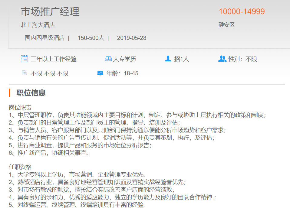 北上海大酒店市场推广经理