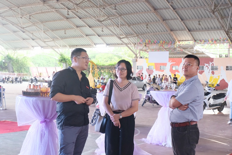 执行院长柴勇、党总支副书记王翔、团委书记吴小柳讨论迎新会场布置