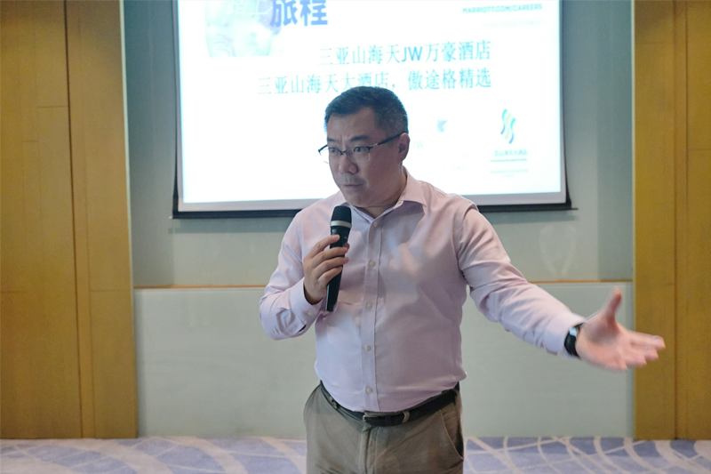 行业参观伊始,由酒店的总经理Mr. Adrian Chan陈国正先生为大家介绍了两个酒店概况以及成长史,三亚山海天JW万豪酒店作为海南省首家JW万豪酒店,秉持着极致奢华的品牌哲学理念,专为家庭度假提供细意雕琢且恰到好处的住宿服务。而傲途格精选更是大中华区首家傲途格,谢绝毫无新意的简单模仿,立志打造独树一帜的别致体验,专为喜欢潮流的年轻人而设计。随后,陈国正总经理与大家一同回顾了23年的酒店职业生涯,从最初的实习生到如今的酒店总经理,见证了我国酒店行业的逐渐兴起。在介绍酒店及个人职业生涯情况之后,Mr. Adrian Chan与我院在座学生关于就业前景以及职业规划等展开交流,他表示希望大家选择酒店行业作为未来发展行业后,一定要热爱这个职业并保持努力的初心,万豪集团也将提供更广阔的发展平台供大家选择。接着,陈总经理与人力资源总监Tina Tang、人力资源经理Joy Zhao共同回答了我院学生较关心的酒店发展问题,陈总经理鼓励大家要乐于与人交往,保持对学习、工作的激情,只有这样,才会在未来到达更高的山峰。