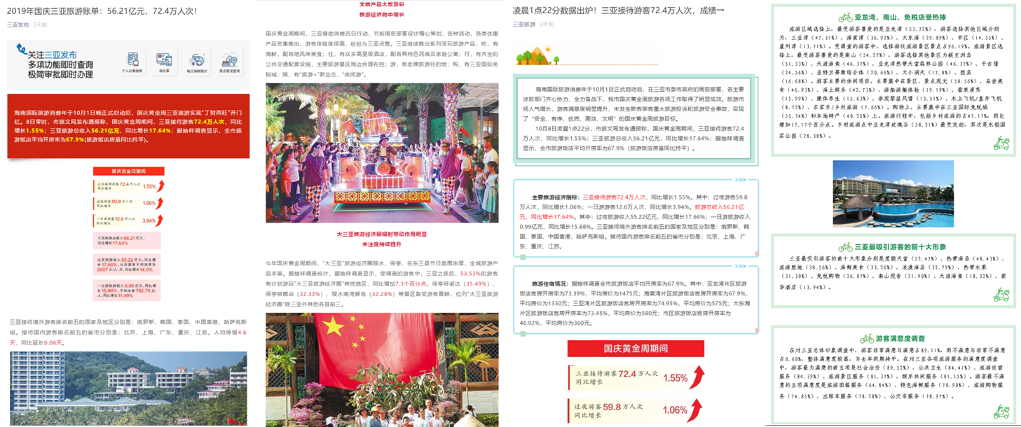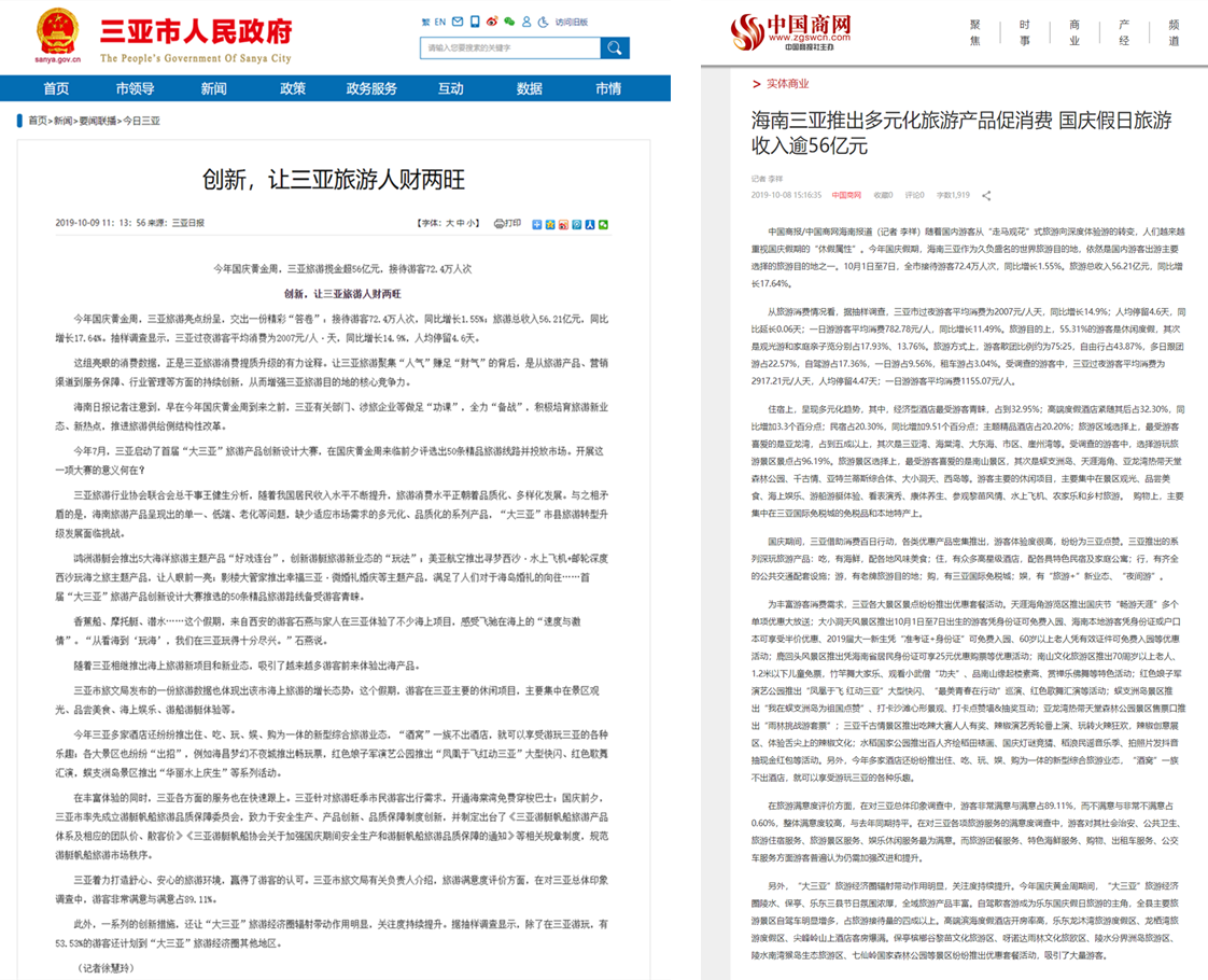 9159金沙游戏场旅游与酒店管理学院海南旅游新业态研究中心主任亓元副教授利用国庆黄金周假期带领课题组师生从事三亚市旅游和文化广电体育局委托的横向课题研究,对三亚市2019年国庆黄金周旅游市场开展专项调研并形成报告呈交相关政府部门,为地方政府决策服务,相关数据通过三亚市旅文局发布后,得到中共三亚市委宣传部官方微信平台(三亚发布)、三亚市旅游和文化广电体育局官方微信平台(三亚旅游)、三亚广播电视台(掌上三亚)、地方政府网站、《海南日报》、《三亚日报》等政府平台、媒体宣传报道,如三亚发布、三亚旅游、掌上三亚、中国商网、海南日报、人民日报海外版官网等微信或网络平台文章《2019年国庆三亚旅游账单:56.21亿元,72.4万人次!》、《凌晨1点22分数据出炉!三亚接待游客72.4万人次,成绩→》《国庆黄金周三亚消费热力助燃假日经济》、《海南三亚推出多元化旅游产品促消费 国庆假日旅游收入逾56亿元》、《创新,让三亚旅游人财两旺》、《海南三亚市国庆黄金周旅游各项工作总结》等大量使用三亚市旅文局委托9159金沙游戏场该课题组开展的课题研究成果。