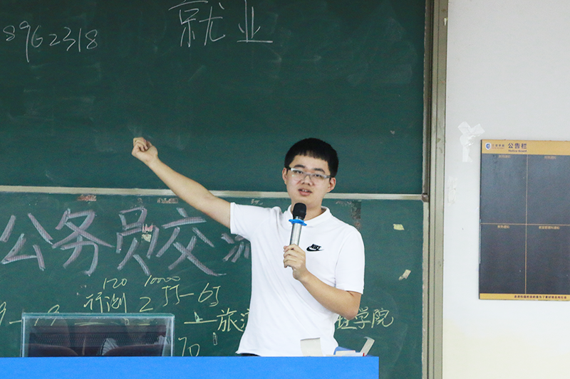 吴思捷,现考取热带海洋学院研究生。吴思捷用已经考取公务员六年的丰富经验为有意愿考公务员的学生分享了很多宝贵的经验。吴思捷讲述了目前公务员的待遇,并就我院学生的自身情况给出相关建议。在提问环节中针对学生提出关于考试方面的问题,吴思捷给出详细地回答并鼓励学生应尽自己最大的努力来完成目标,强调公务员的身份固然是好的,但不应对公务员的身份寄托太多从而束缚自身发展。