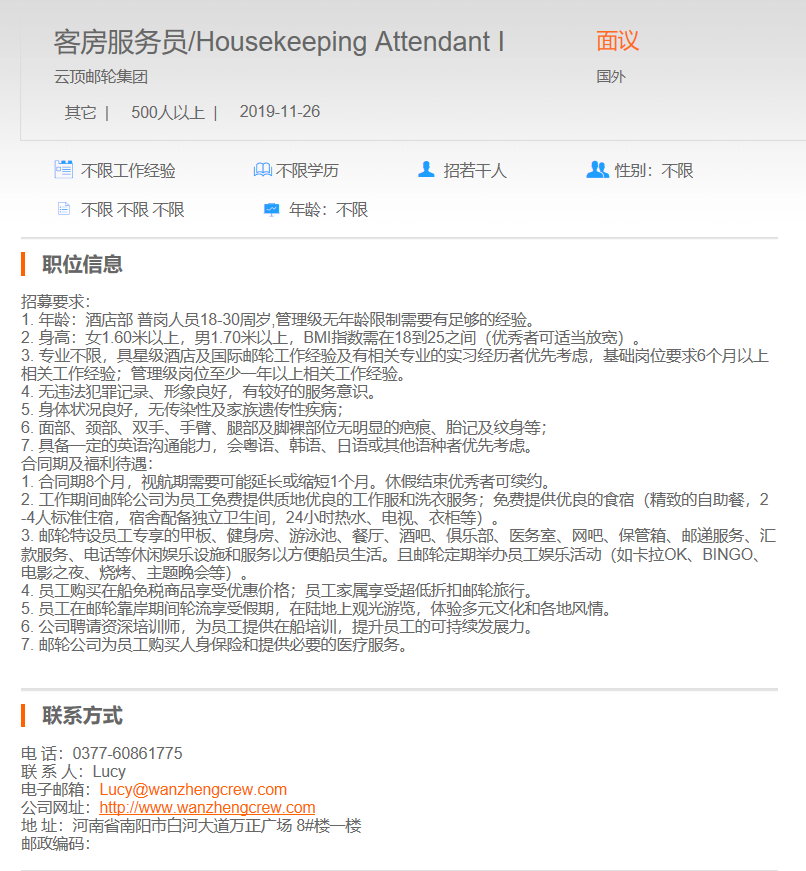 云顶邮轮集团客房服务员