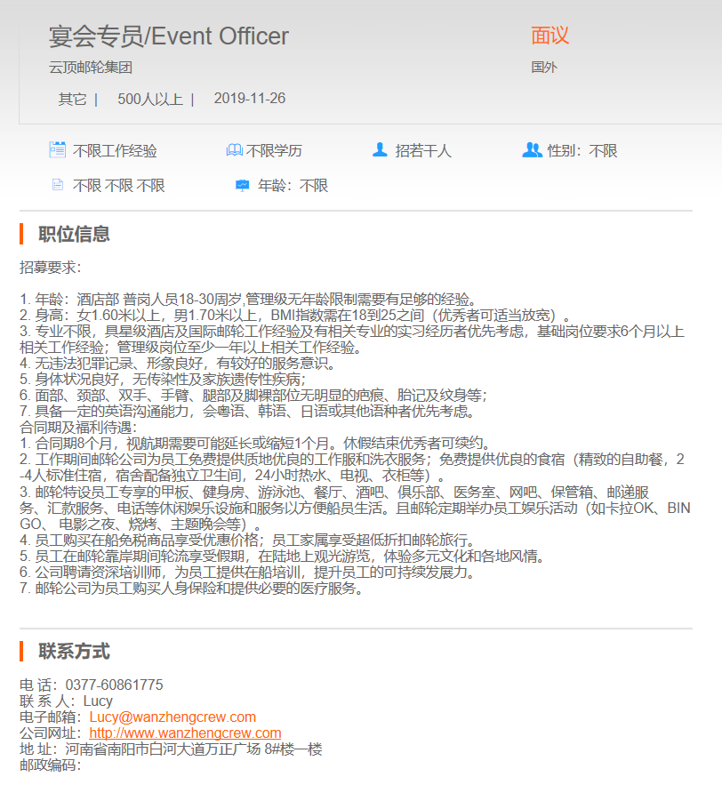 云顶邮轮集团宴会专员