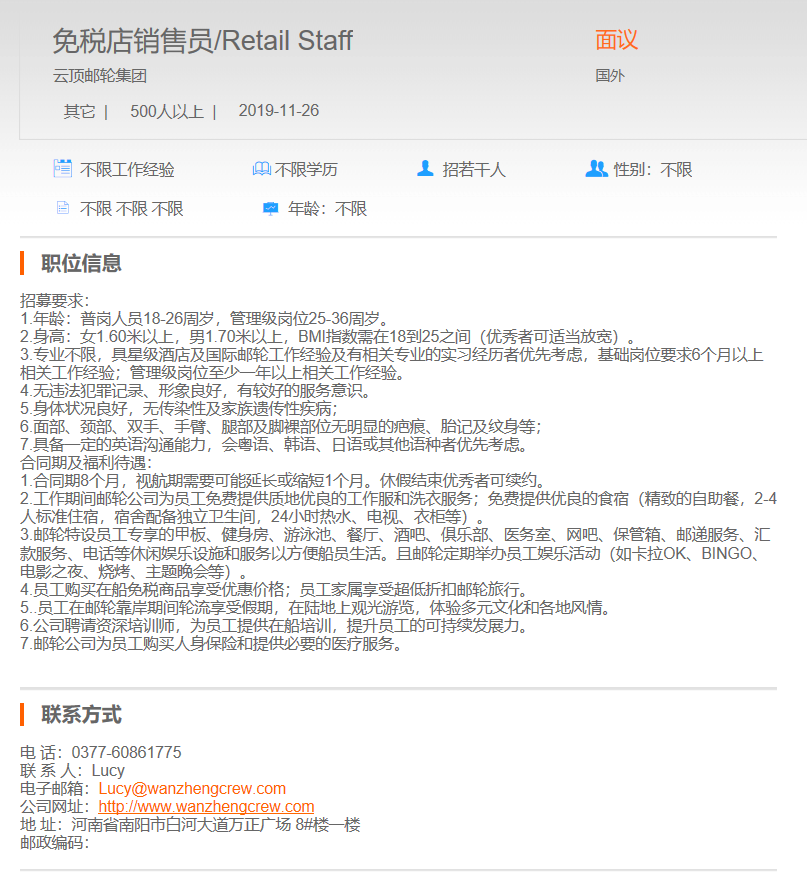 云顶邮轮集团免税店销售员