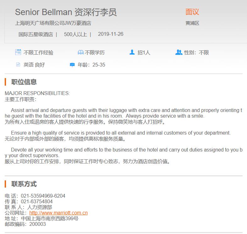 上海明天广场JW万豪酒店资深行李员