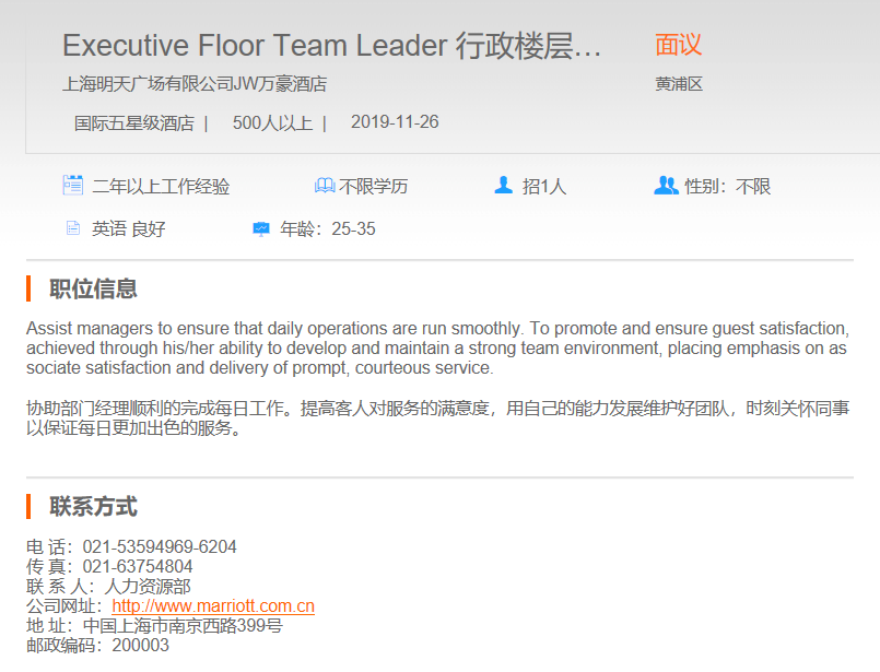 上海明天广场JW万豪酒店行政楼层领班