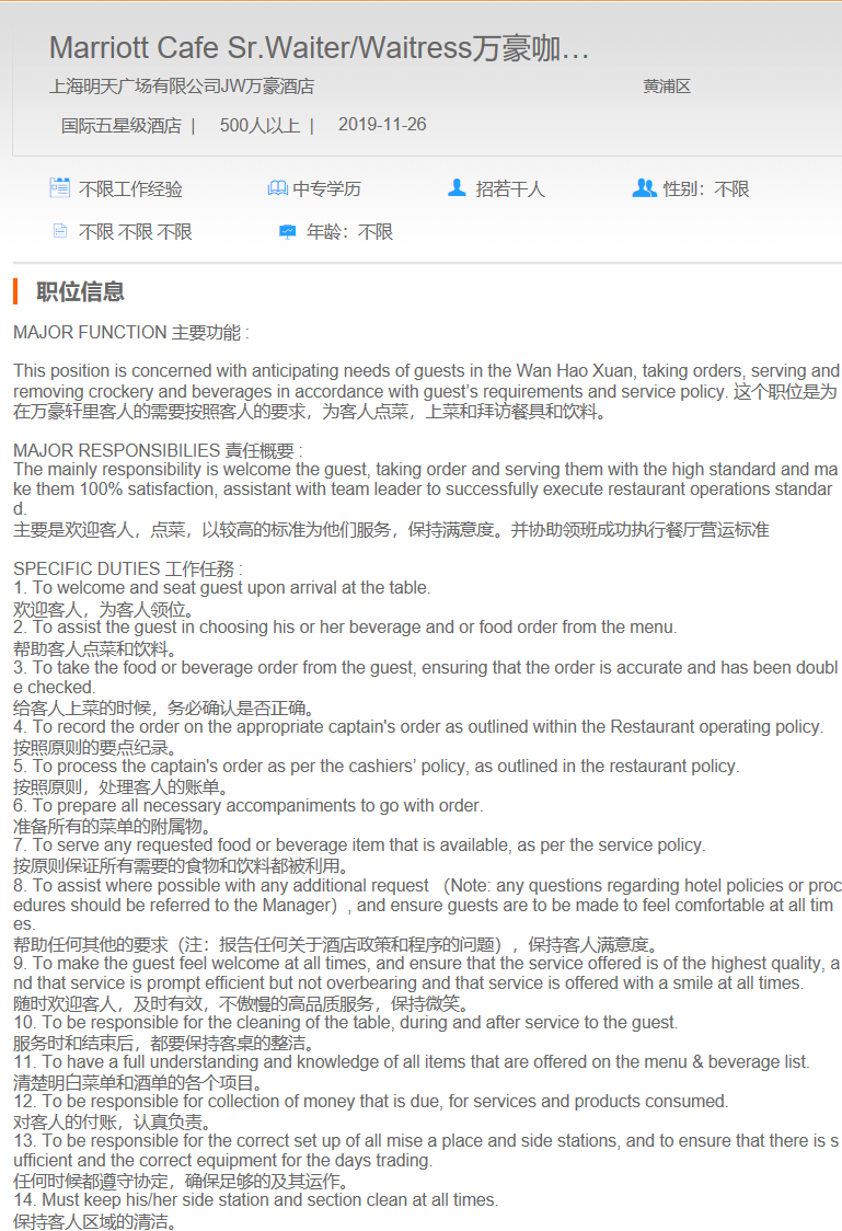 上海明天广场JW万豪酒店咖啡厅资深服务员