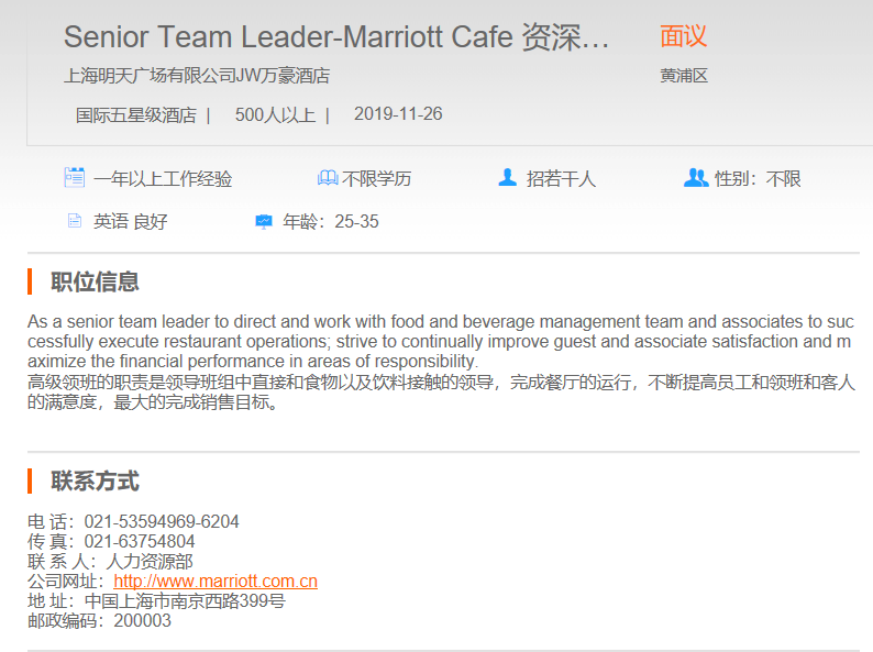 上海明天广场JW万豪酒店资深咖啡厅领班