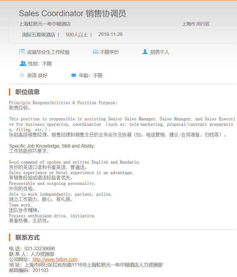 上海虹桥元一希尔顿酒店销售协调员