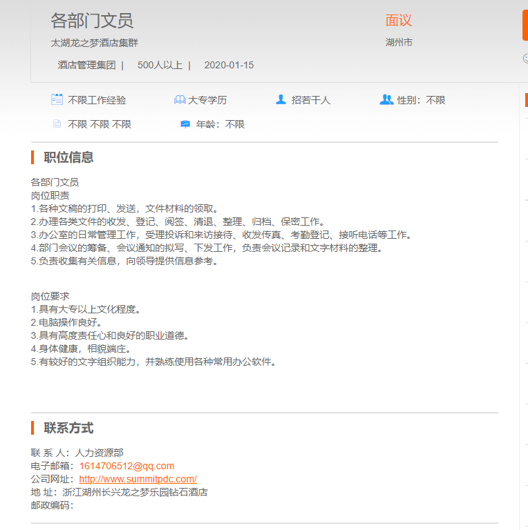 太湖龙之梦酒店集群各部门文员