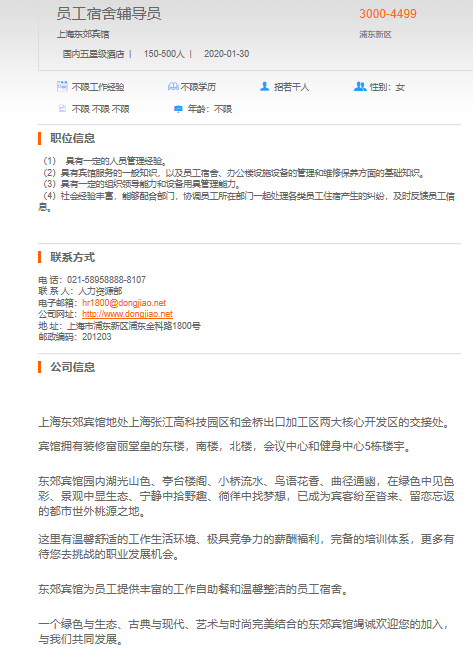 上海东郊宾馆员工宿舍辅导员