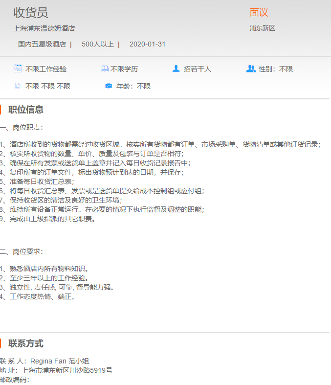 上海浦东温德姆酒店收货员