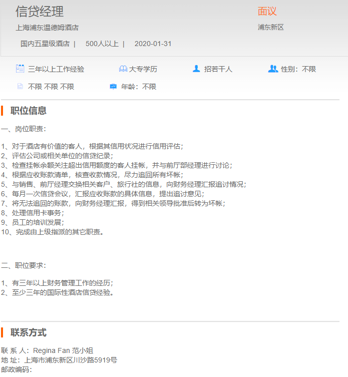 上海浦东温德姆酒店信贷经理