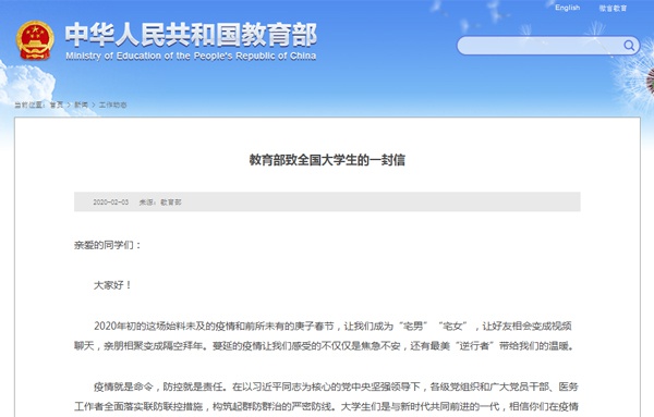 亲爱的同学们,乌云遮不住升起的太阳,疫情挡不住春天的来临,让我们紧密团结在以习近平同志为核心的党中央周围,坚定必胜信念,万众一心,众志成城,夺取抗击疫情斗争的最终胜利。我们也将与学校的老师们一道,在全国各地的校园里期待着在庚子年的春天与大家重逢!