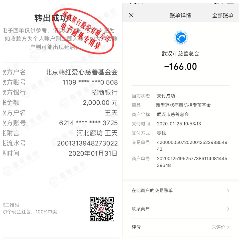 王天:之前在网上看到过关于医护人员奋战一线的视频,感触非常大,心里十分难受。之后观看了上海张文宏教授的视频,里面提到了关键时刻就是应该党员先上,党员应起到带头作用,而我也是一名中共党员,全国人民都在支援武汉,我就想到了通过捐款的方式来奉献自己的力量,后来了解到北京韩红爱心慈善基金会可以直接捐赠物资到湖北,于是拿出了自己年底所得的2000余元年终奖金,也算贡献了自己的一份力量。