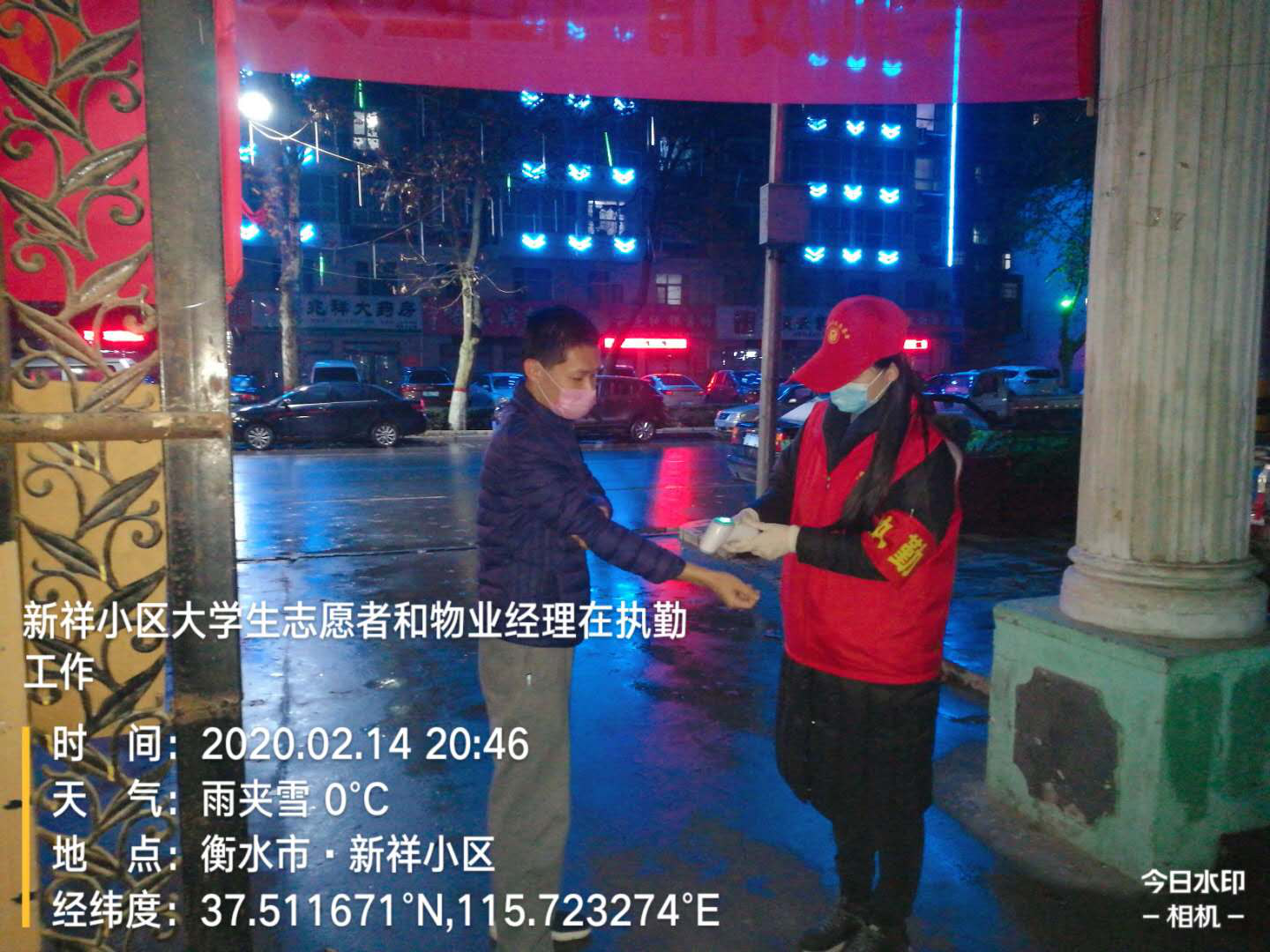 旅行社1601班张姣加入社区志愿服务后从下午两点半到五点在河北省衡水市新祥小区检查进出小区业主的出入证,单位证明,测体温并登记出入时间。“我作为一名预备党员,多做一些为人民服务的事,在我成长中留下快乐的经历。”